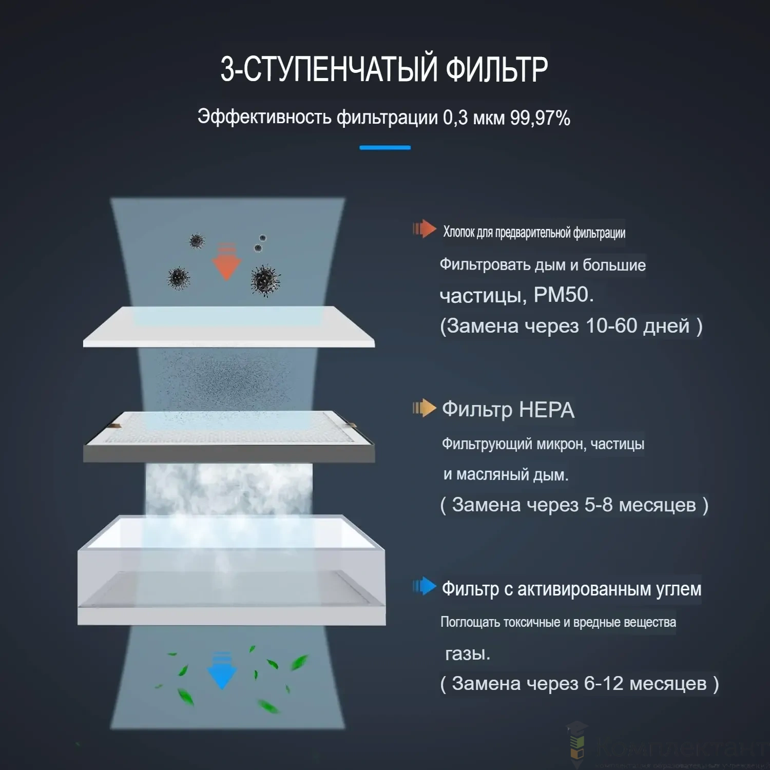 - 3-слойная фильтрация и 99,97% степень удаления дыма: с предварительным фильтром, расширенным фильтром и основным фильтром вытяжная система эффективно очищает воздух, достигая степени очистки до 99,97%.