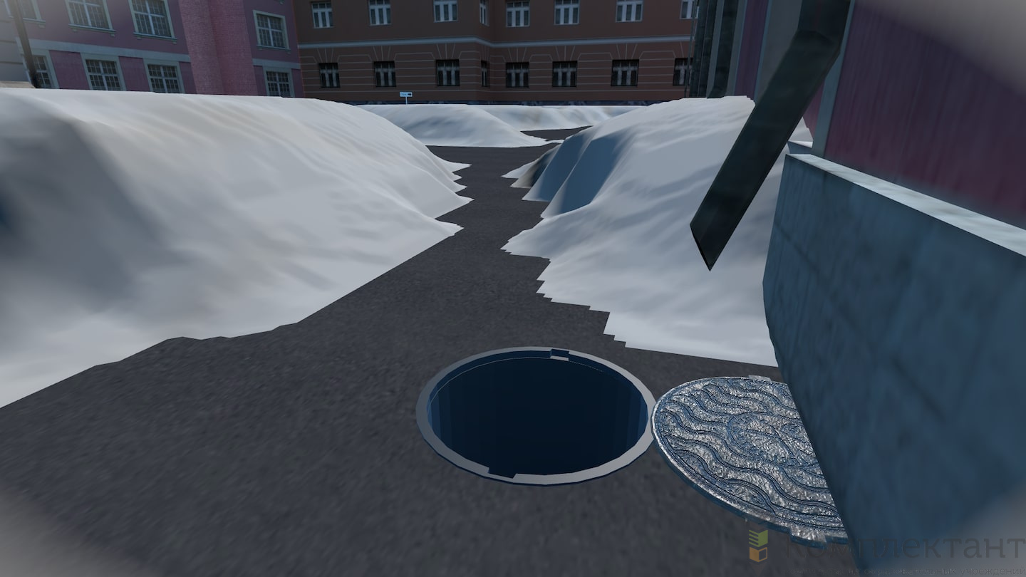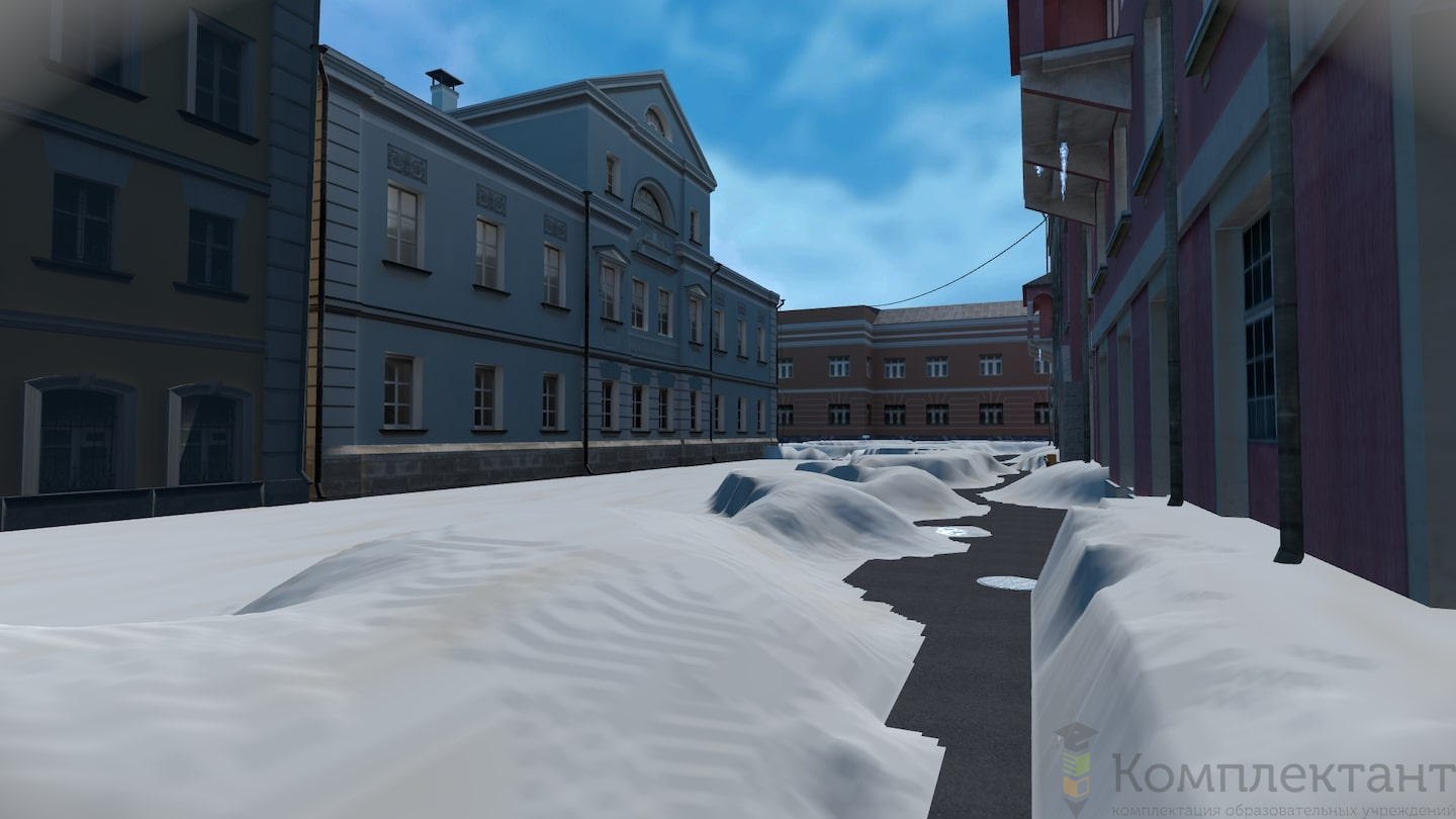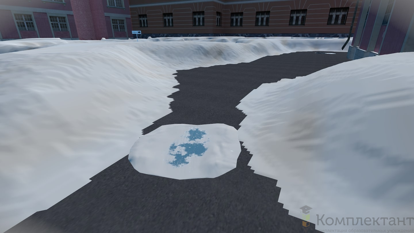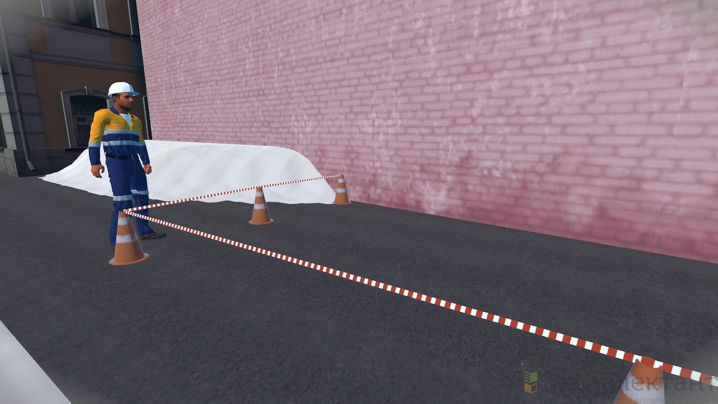 Виртуальный (VR) тренажер «Безопасность по дороге на работу» воссоздает ситуацию, в которой пользователю после аномального снегопада предстоит добраться от машины, припаркованной во дворе, до входа в офис на противоположном конце двора. На его пути будут возникать различного рода препятствия (открытые люки, сосульки на крышах, сброс снега с крыши и др.), которые пользователю необходимо преодолеть.