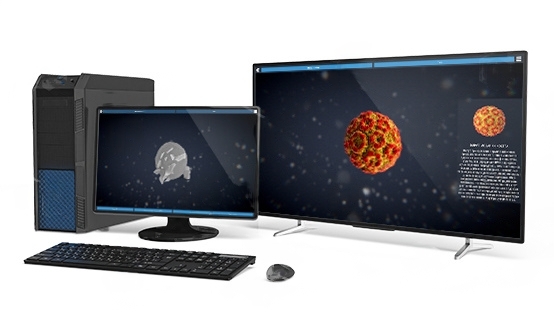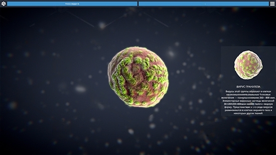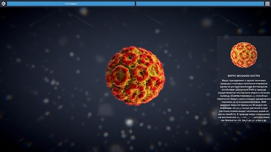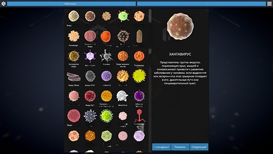 Специализированное программное обеспечение предназначено для проведения исследований строения различных вирусов человека посредством анимации и трехмерной графики. Комплекс выводит на экран интерактивные трехмерные модели различных структур входящих в состав вирусных клеток, а также дает возможность изучать жизненный цикл некоторых вирусов. В состав учебного комплекса входит модуль справочной информации с подробными описаниями, картинками и схемами.