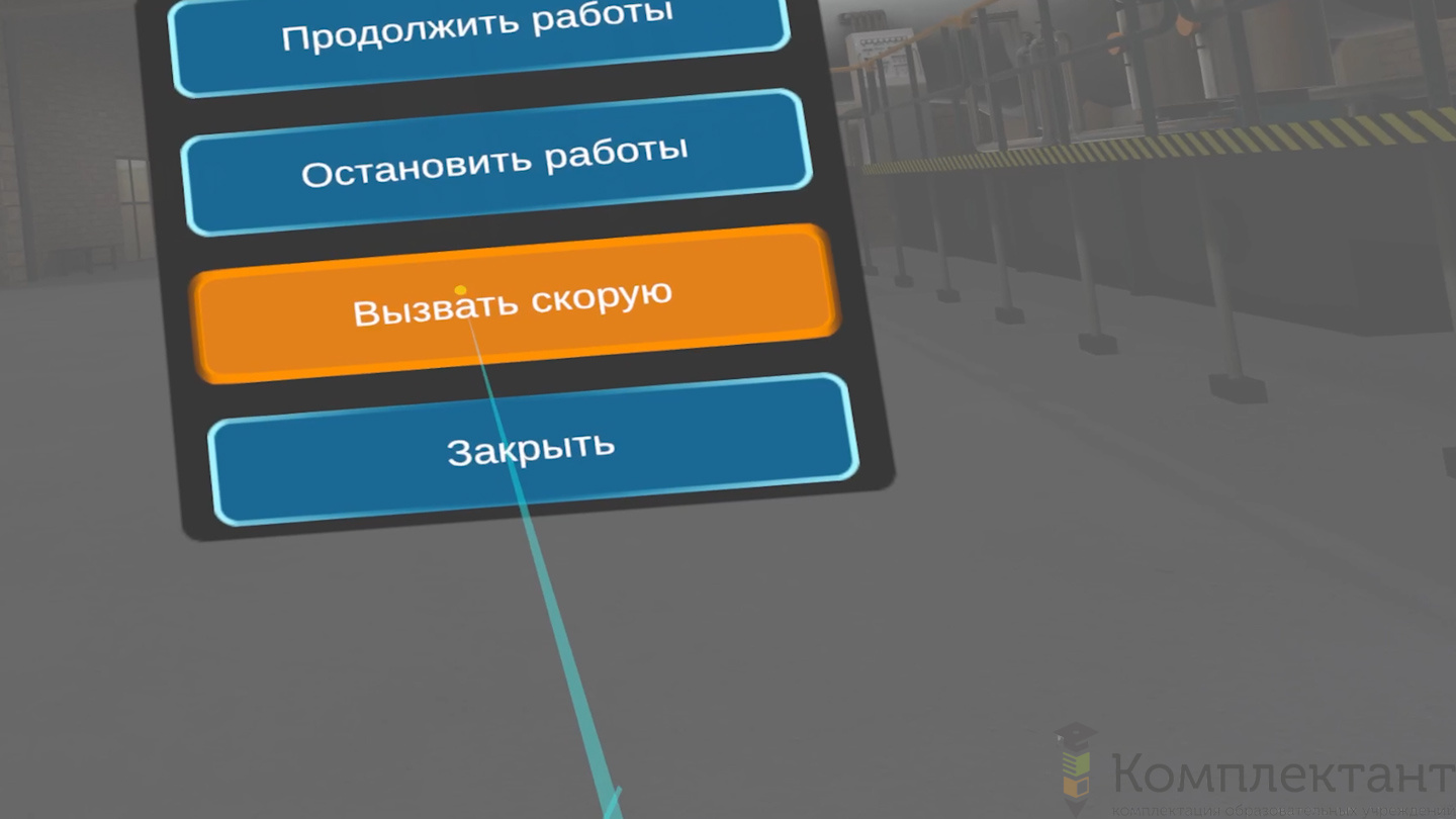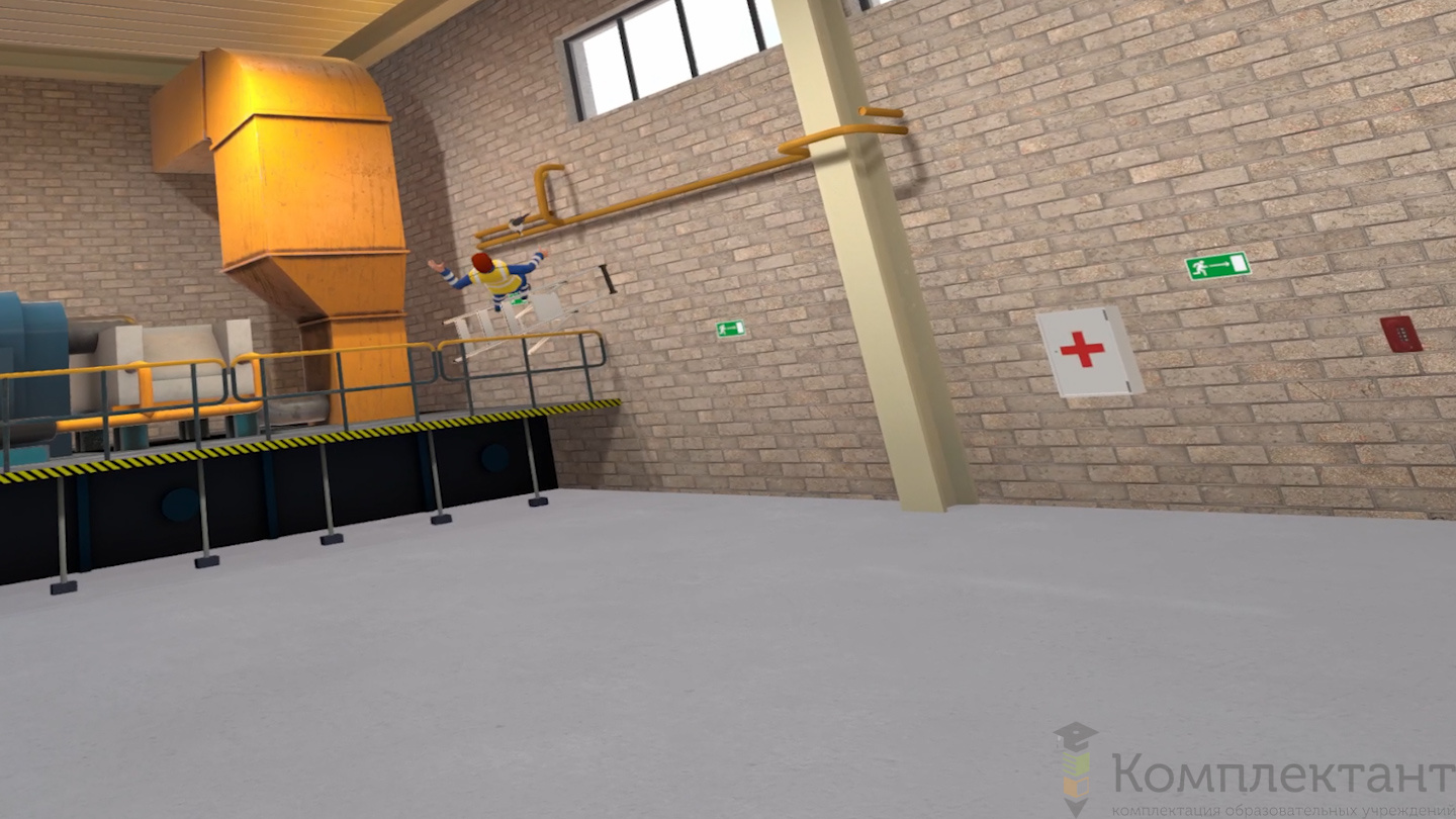 Пользователь окажется свидетелем падения коллеги с лестницы, которое привело к потере сознания и травме ноги. Пользователю будет необходимо прекратить работу, взять аптечку и проверить состояние пострадавшего работника. Затем попросить своего коллегу вызвать скорую помощь и начать делать искусственное дыхание для поддержания жизни пострадавшего, далее дождаться скорую помощь. VR-тренажер научит пользователя принимать правильные решения в стрессовой ситуации и действовать в чрезвычайных ситуациях. Благодаря подробной обратной связи и инструкциям пользователь научится эффективно реагировать в реальных чрезвычайных ситуациях.