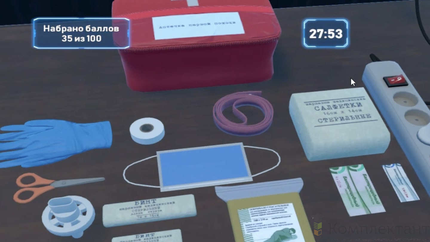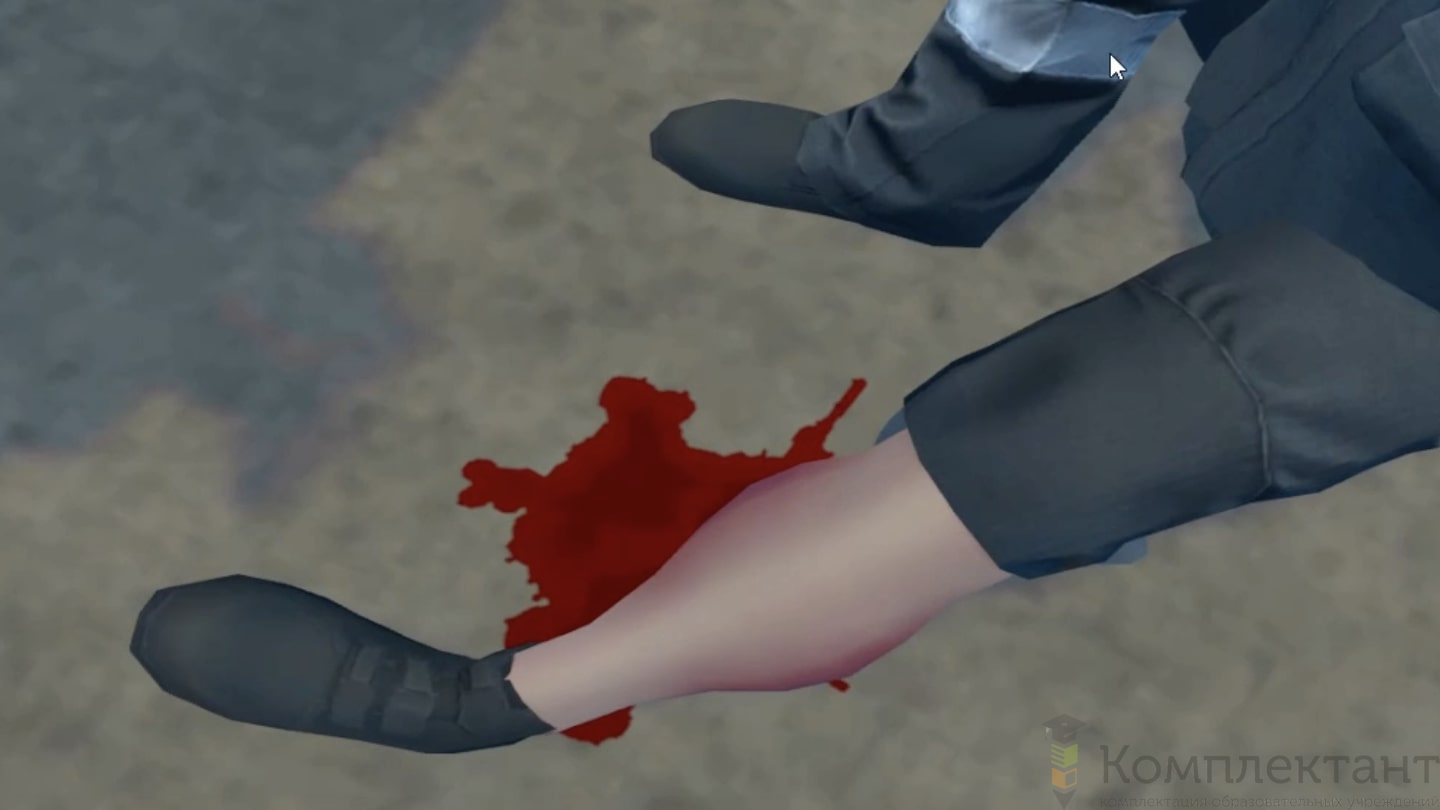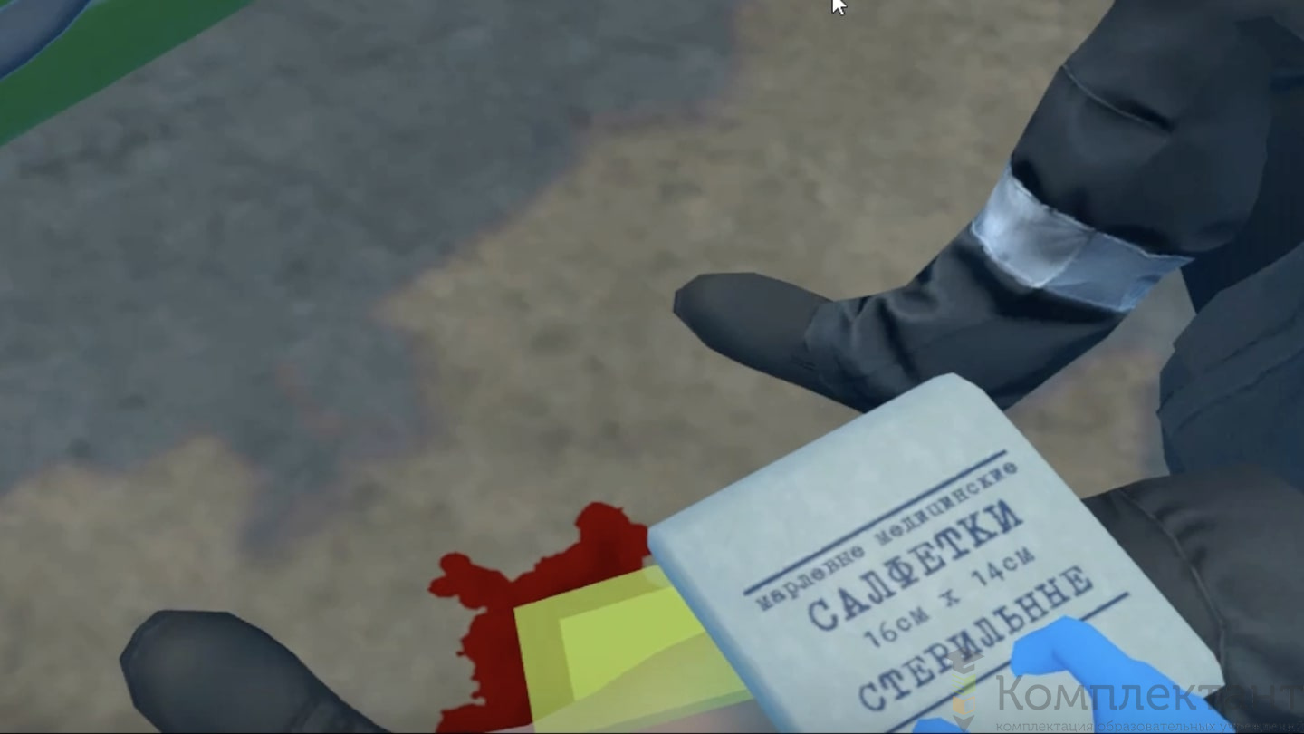 Виртуальный (VR) тренажер «Оказание первой помощи при различных состояниях» воссоздает ситуацию, в которой пользователю необходимо оказать первую помощь товарищу, получившему травму. Вид травмы может быть разным: потеря сознания, ожог, кровотечение, обморожение, перелом, состояние пострадавшего так же разное: наличие или отсутствие дыхания, пульса, сознания, типа кровотечения, перелома. В зависимости от типа предприятия может быть предоставлена общая или специализированная помощь.