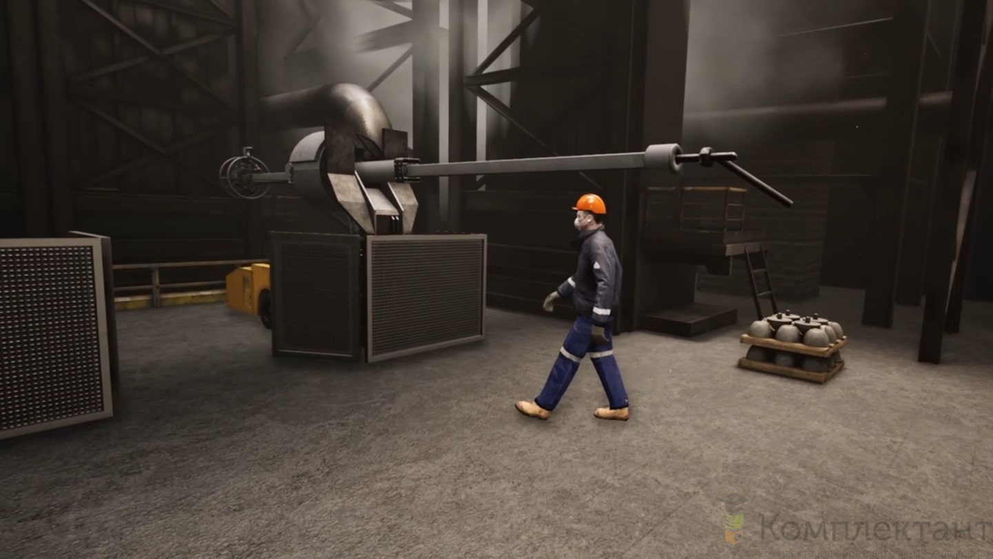 Тренажер «Выплавка конвертерной стали» предназначен для отработки практических навыков сотрудников по выполнению действий до начала и во время ремонта сталевыпускного отверстия, произвести выпуск плавки из конвертера в сталеразливочный ковш путем наклона конвертера. Отработка действий по выполнению операций действий полусухого торкретирования конвертера, прогар сталеразливочного ковша во время выпуска». Отработка ПЛА по позиции «Вынос лёточных блоков после ремонта лётки во время выпуска». Отработка ПЛА по позиции «Прогар конвертера в районе ванны жидкого металла во время продувки плавки». Доступны VR и ПК режимы.