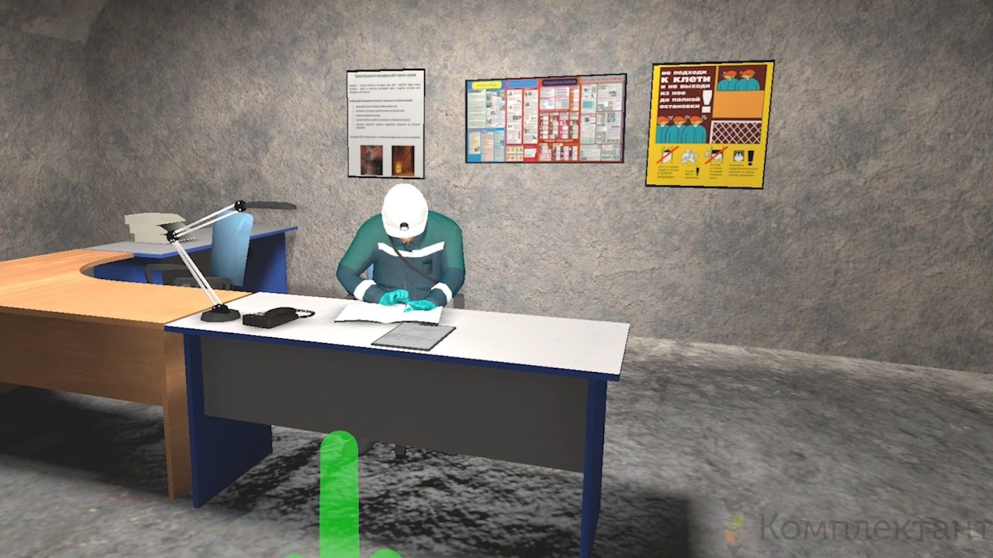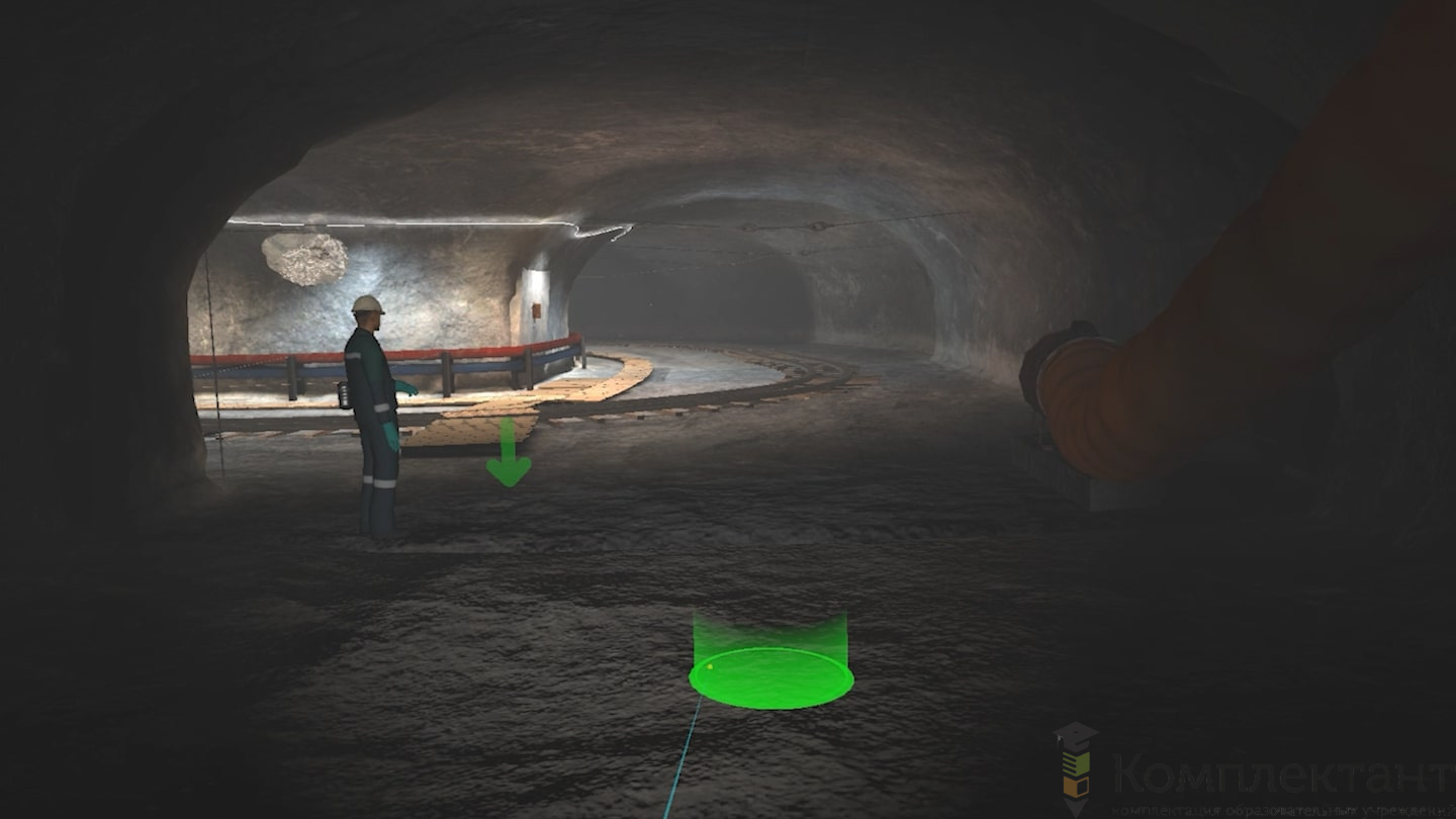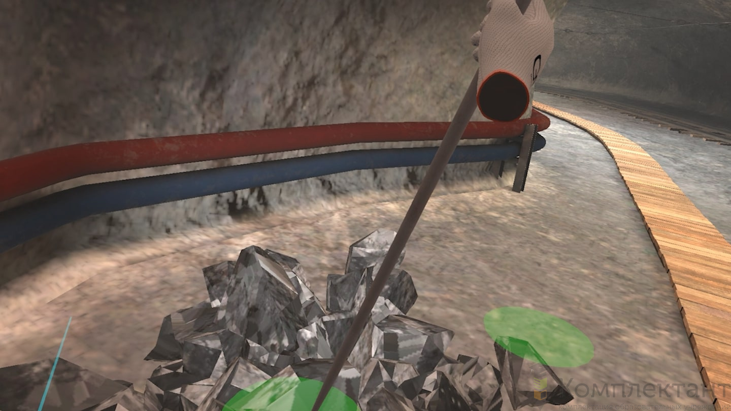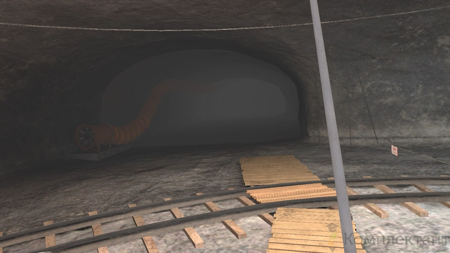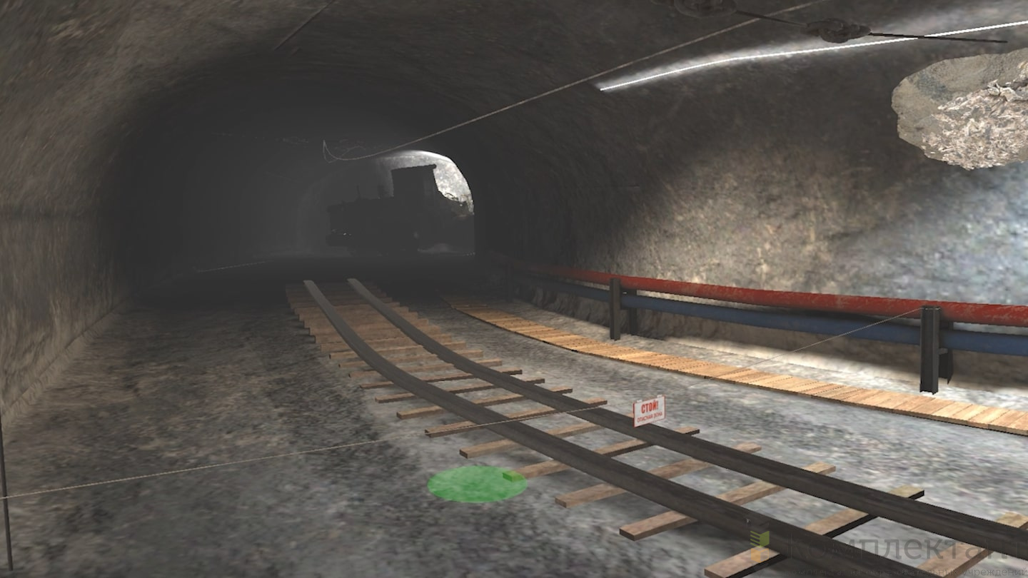 Виртуальный (VR) тренажер «Обеспечение безопасности рабочего места в подземных выработках» воссоздает ситуацию, в которой пользователю необходимо обеспечить безопасность рабочего места в подземной выработке. Пользователь начинает прохождение симуляции с получения наряда-допуска на работы. Он должен взять обезопаску и проследовать на своё рабочее место. По пути пользователь встречает различные типы заколов, которые появляются случайным образом. Их нужно снять самостоятельно или обратиться за помощью к коллегам.