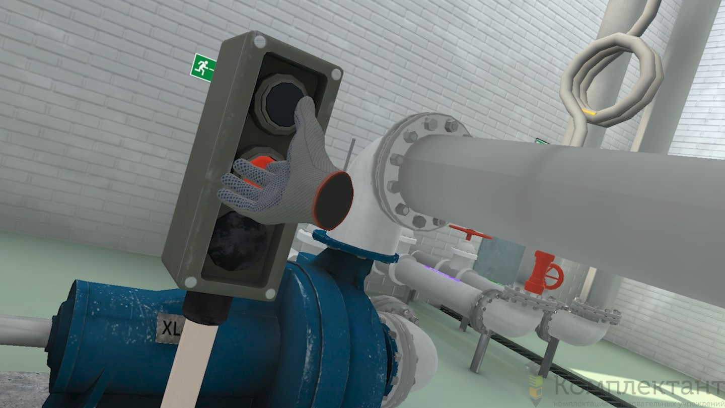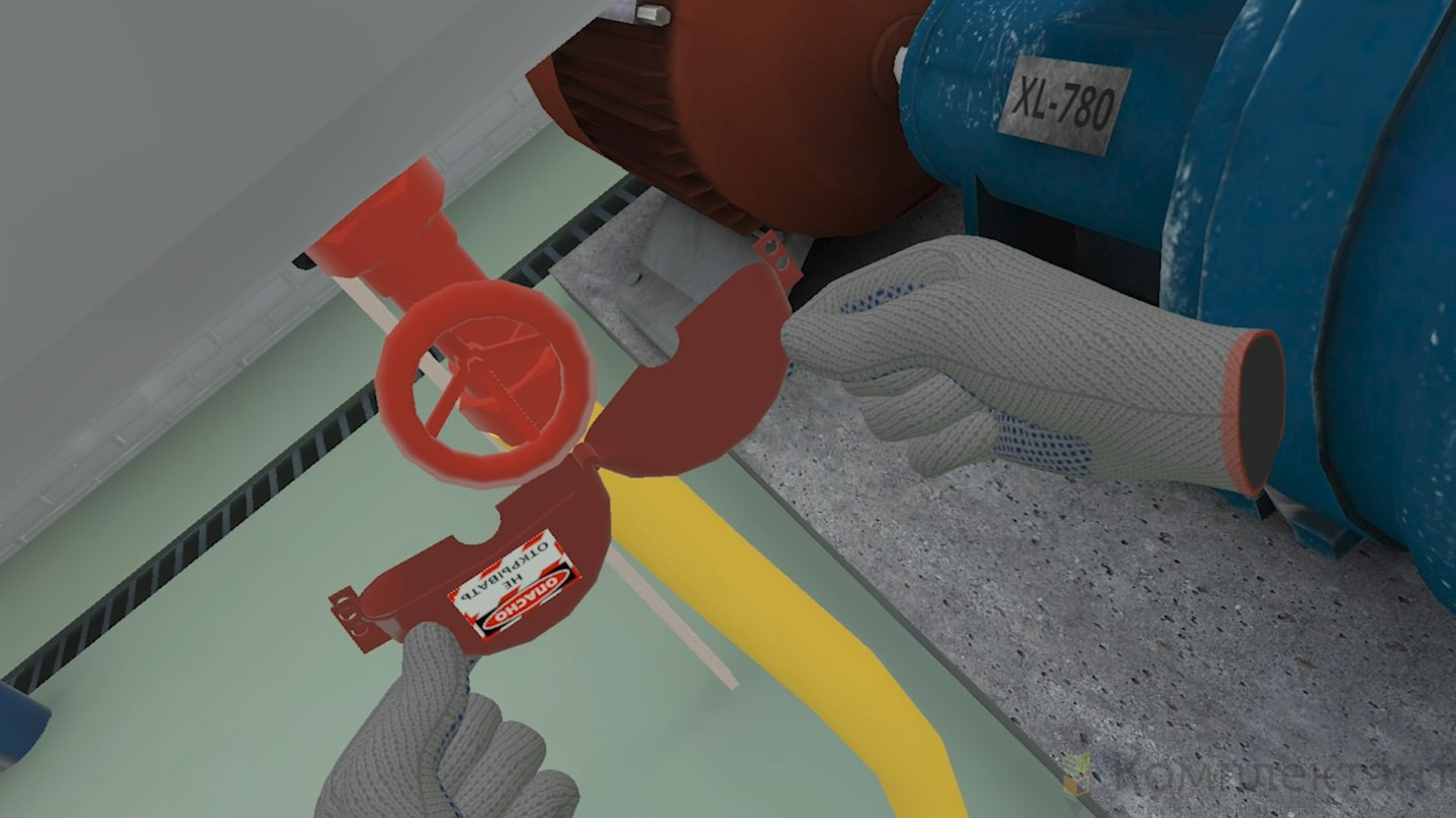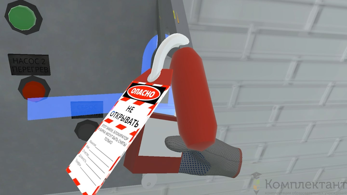 Виртуальный (VR) тренажер «Маркировка-блокировка» воссоздает ситуацию проведения процедуры блокировки-маркировки. В процессе которой пользователю необходимо временно изолировать оборудование от всех источников энергии и обеспечить такое обесточенное состояние, пока продолжается техобслуживание машины. В симуляции обучающийся должен провести физическую изоляцию электрической и гидравлической опасной энергии в соответствующем оборудовании при помощи инструментов процедуры блокировки-маркировки, а именно: установки блокираторов на систему, далее замка с индивидуальным ключом для пользователя и установки ярлыка маркировки с подписью, датой и указанием проводимых работ.